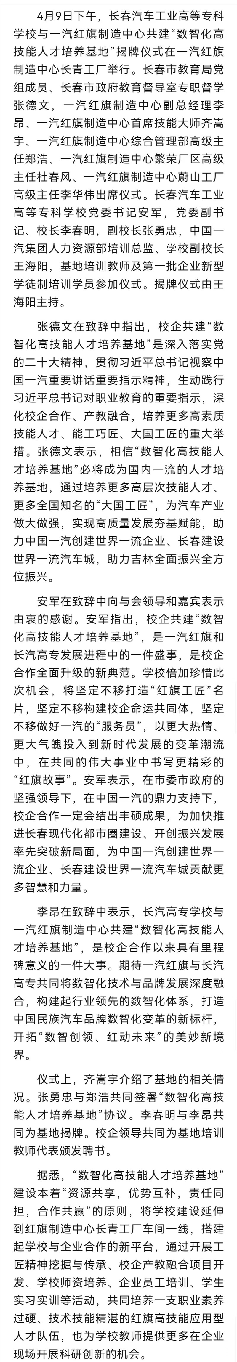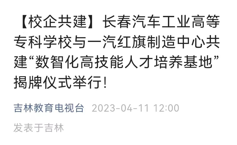 吉林教育电视台——【校企共建】长春汽车工业高等专科学校与一汽红旗制造中心共建“数智化高技能人才培养基地”揭牌仪式举行!