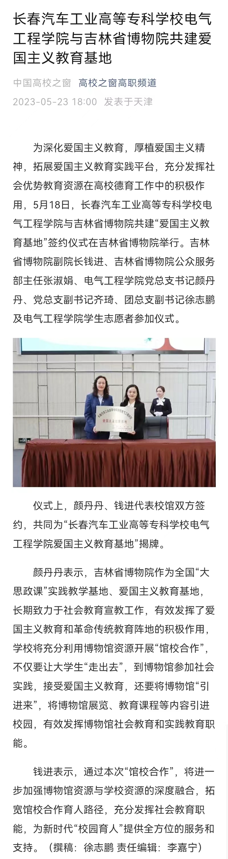 中国高校之窗——长春汽车工业高等专科学校电气工程学院与吉林省博物院共建爱国主义教育基地