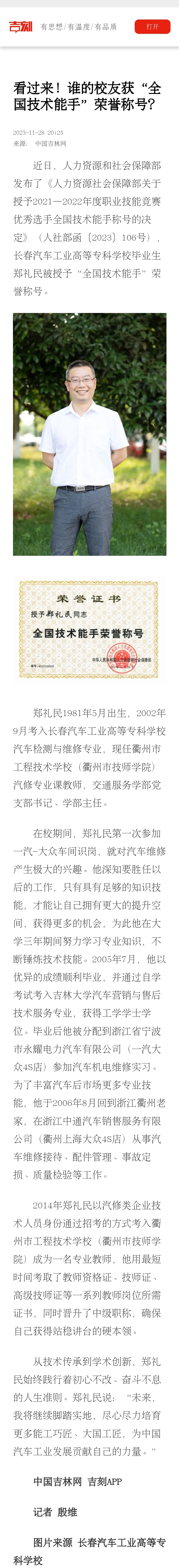 中国吉林网——看过来!谁的校友获“全国技术能手”荣誉称号?