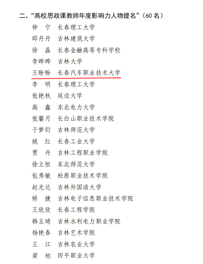 为深入学习贯彻习近平总书记在全国教育大会上的重要讲话精神和新时代学校思政课建设推进会精神,大力弘扬教育家精神,推动新时代高素质专业化教师队伍建设,全面落实“时代新人铸魂工程”工作部署,表彰和推广在思政课教学及研究领域成绩显著的教师,吉林省教育厅举办了2024年度“高校思政课教师年度影响力人物”推选展示活动。